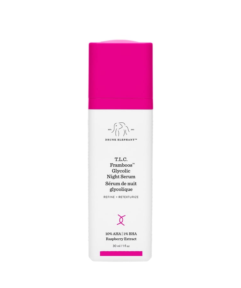 Drunk Elephant T.L.C. Framboos Glycolic Night Serum is an overnight exfoliating serum that helps smooth rough texture and bring back glow. It uses a blend of 10% AHAs + 1% BHA to gently lift away built-up dead skin, which can make pores look smaller and skin look clearer by morning. It’s best used at night, a few times a week at first, then more often if your skin handles it well.